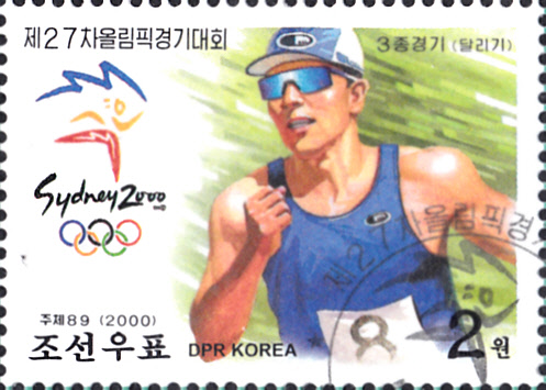 Beim Triathlon wird als dritter Wettbewerbsteil ein unterschiedlich langer Lauf absolviert. Auf dieser Marke aus Korea-Nord (MiNr 4381) wird ein Läufer gezeigt, der auf einer Triathlon-Strecke unterwegs ist.