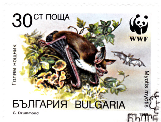 Auf dieser Marke aus Bulgarien (Mi 4743) wird uns ein Großes Mausohr (Myotis myotis) vorgestellt.