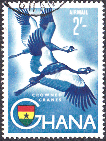 Auf dieser Marke aus Ghana (MiNr 62) sind zwei fliegende Kronenkraniche (Balearica pavonina) zu sehen.