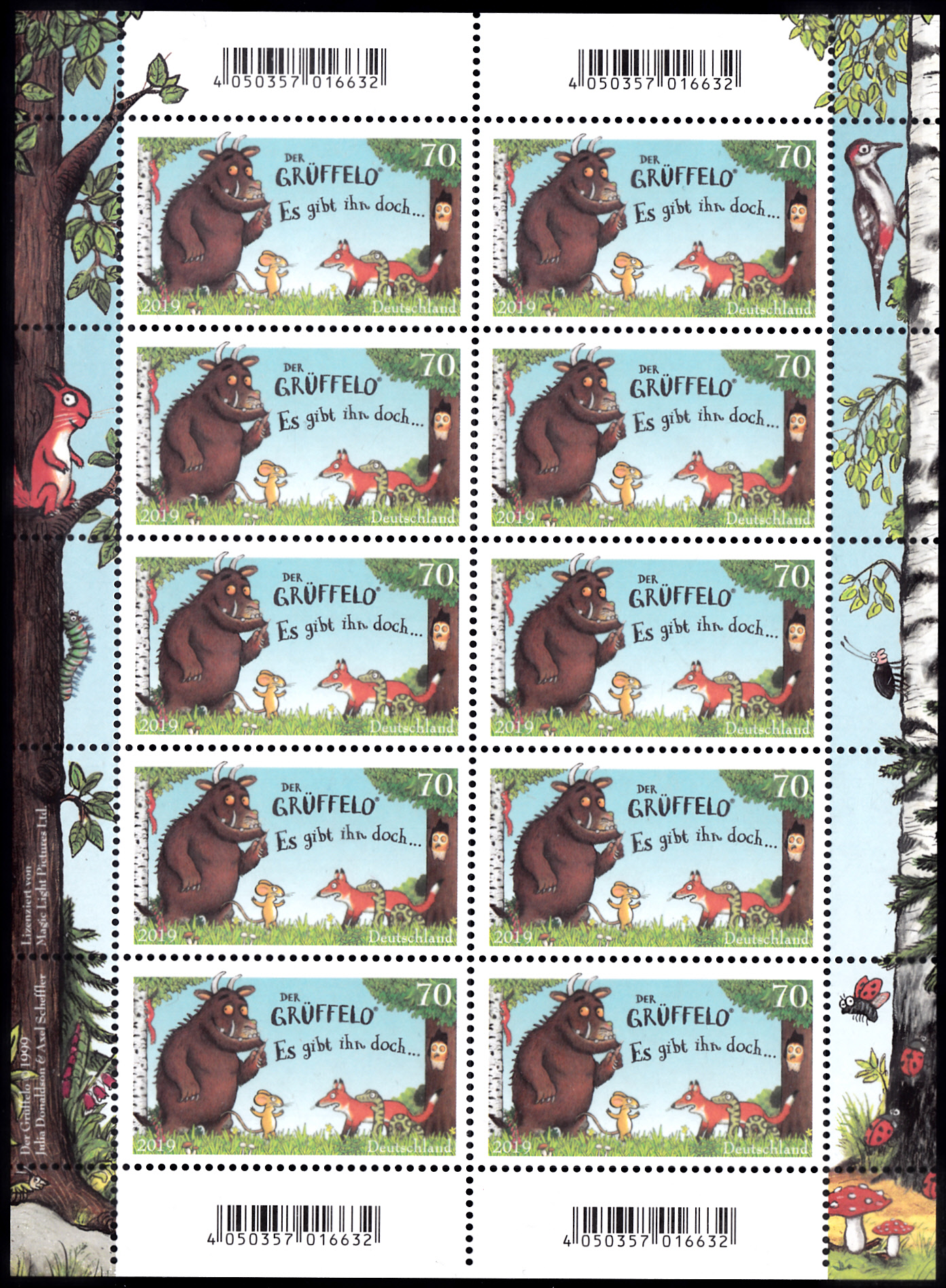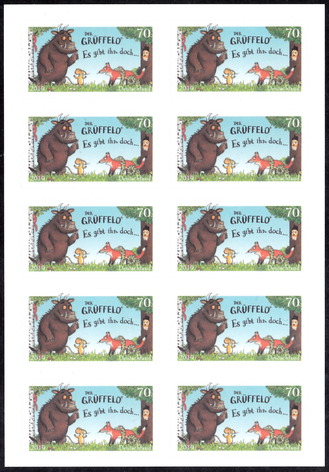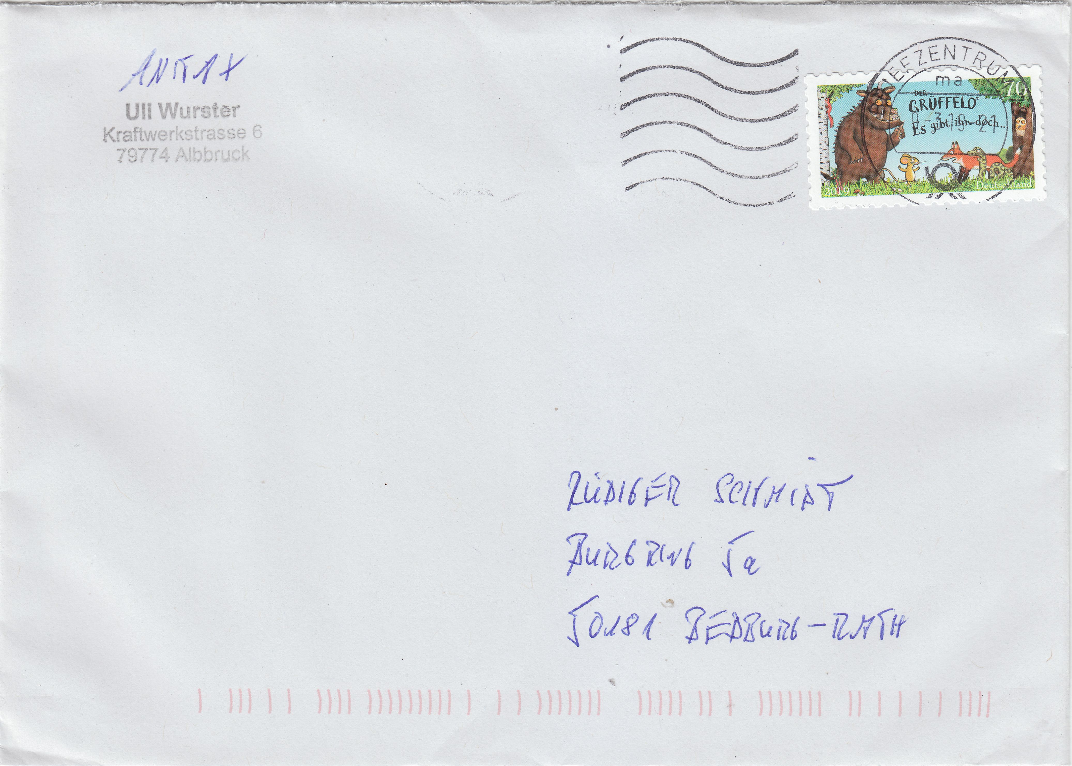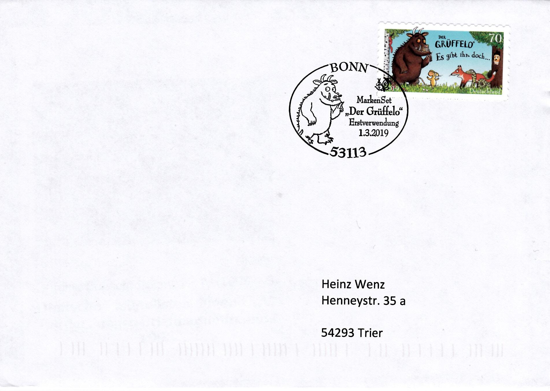 In Deutschland erschien 2019 diese Sondermarke zum Thema "Grüffelo", hier als portorichtige Einzelfrankatur auf einem aktuell bei mir eingegangenen Bedarfsbrief: