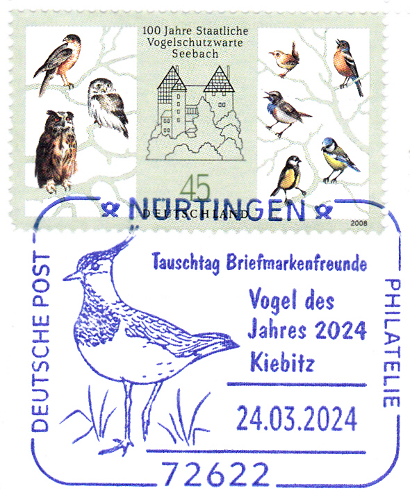 Sonderstempel aus Nürtingen vom 24.3.2024 mit einem Kiebitz, dem Vogel des Jahres 2024.