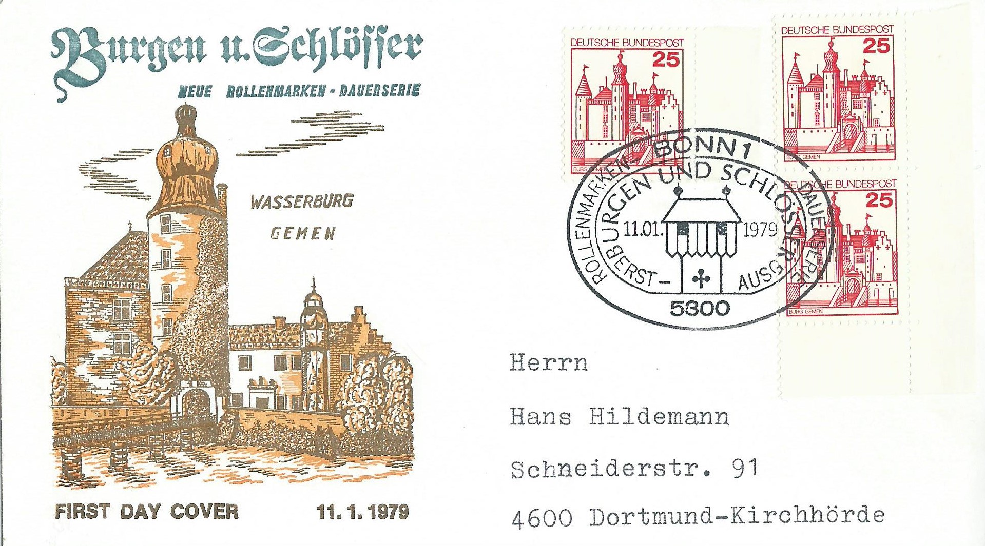 Gefolgt vom Wert zu 25 Pf: Einmal als senkrechtes Paar aus der rechten unteren Bogenecke und einer Einzelmarke vom rechten Bogenrand auf einem Ersttagsbrief. Gestempelt wurde mit dem Ersttagssonderstempel Bonn vom 11.1.1979.