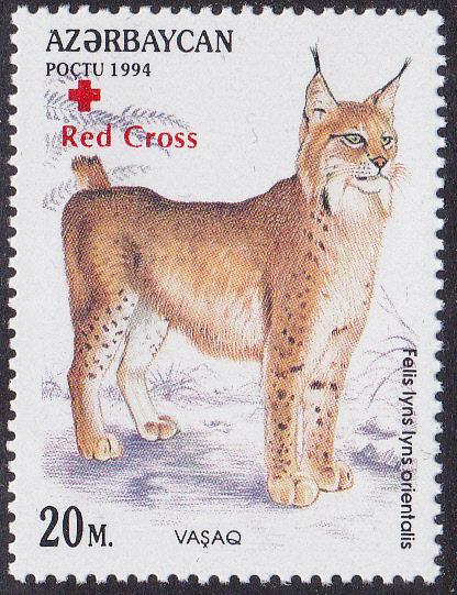 Aus Aserbaidschan kommt diese Marke mit einem Kaukasischer Luchs (Lynx lynx orientalis). Die hier gezeigte Marke (MiNr 363) hat einen roten Bdr.-Aufdruck "Red Cross" und ein rotes Kreuz. Die Marke gibt es auch ohne Aufdruck (MiNr 180).