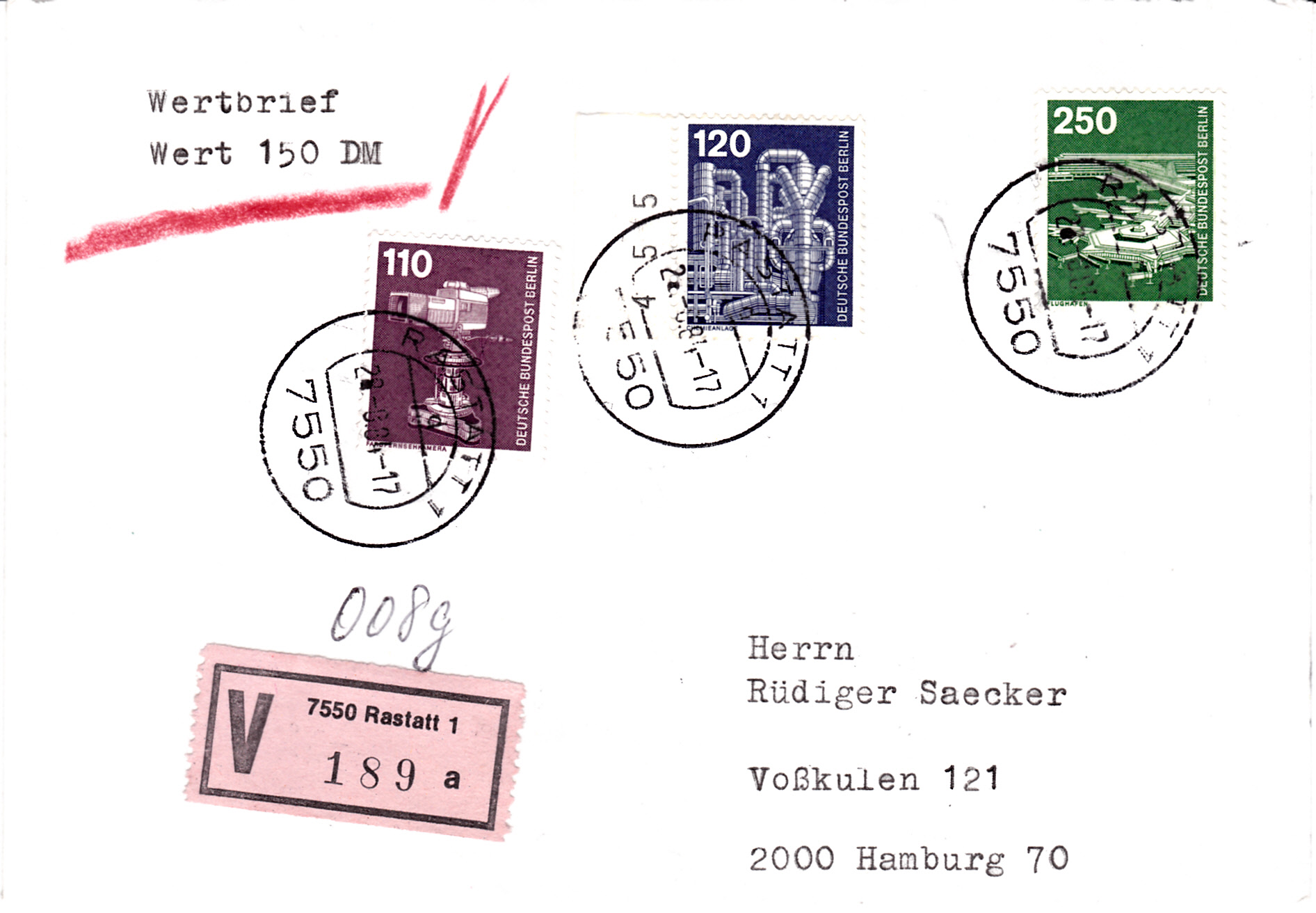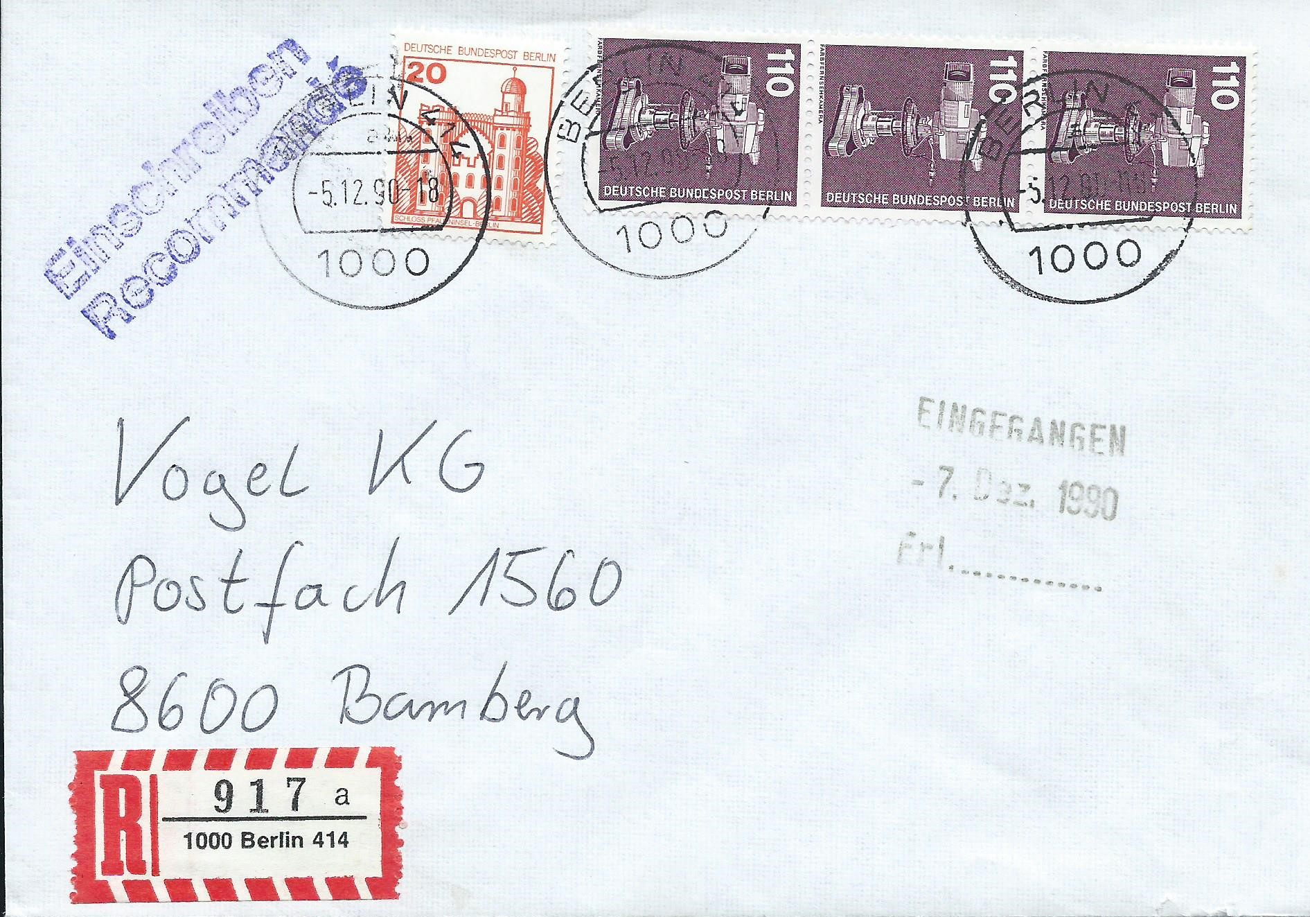 Dazu noch einen weiteren Beleg mit einem waagerechten Paar vom Oberrand mit den Reihenwertzählern 77,00 und 88,00 als Einschreiben aufgegeben. Gestempelt wurde hier mit dem Ersttagssonderstempel Berlin vom 16.6.82. Der Beleg entspricht leider keiner gängigen Portostufe, er ist um 10 Pf überfrankiert. Aber das stört mich weniger, mir geht es um das Paar an sich und so bleibt das gute Stück in der Sammlung.