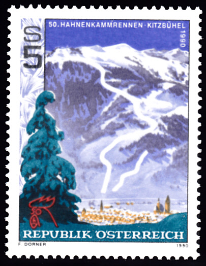Zum 50. Hahnenkammrennen in Kitzbühel ist in Österreich eine Marke (MiNr 1979) mit einer Ortsansicht von Kitzbühel mit dem Hahnenkamm mit eingezeichneter Abfahrtsstrecke "Streif" und Slalompiste "Ganslernhang".