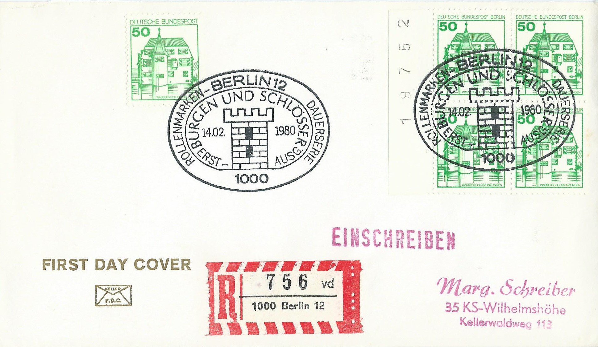 Und als zweites ein Einschreiben als Ersttagsbrief mit dem passenden Ersttagssonderstempel Berlin vom 14.2.80. Frankiert wurde mit einer Einzelmarke und einem 4-er-Block vom linken Bogenrand mit Bogenzählnummer. Mit 2,50 DM ist er leider nicht portorichtig frankiert, ein normaler Einschreibbrief kostete zu der Zeit 2,10 DM.