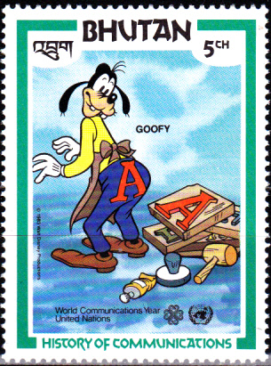 In Bhutan erschien am 10. April 1984 zum Weltkommunikationsjahr eine Briefmarkenserie mit Walt-Disney-Figuren. Auf dieser Marke (MiNr 830) aus der Serie sehen wir Goofy als Drucker.