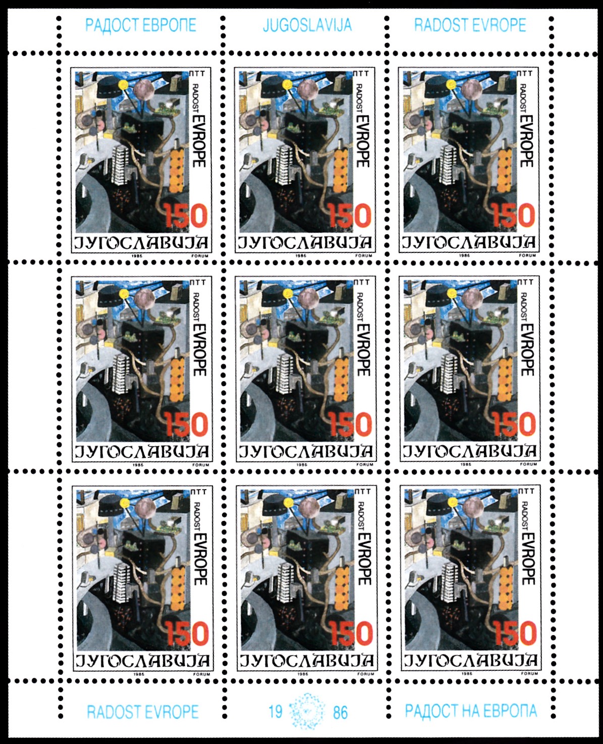 Auf der Marke aus Jugoslawien (MiNr 2194) zum Europäischen Kindertreffen "Freude Europas" im Jahre 1986 zeigt die Kinderzeichnung "Friedenstaube, Kind auf Weltkugel" von Tanja Faletic (14 J.).