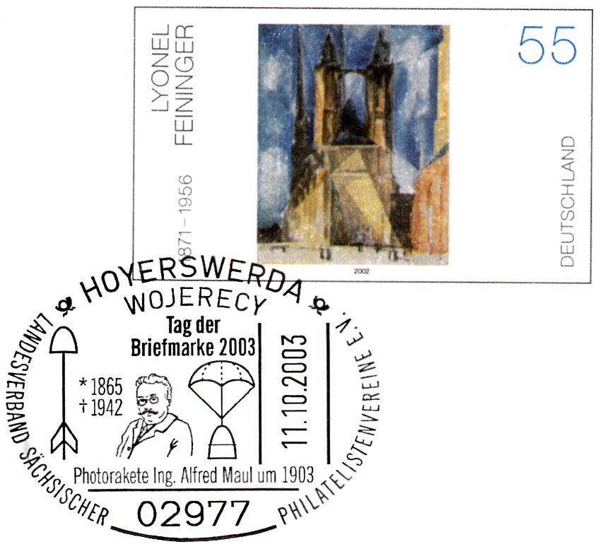 Plusbrief "Lyonel Feininger" (MiNr USo 45) mit Zudruck des Landesverbandes Sächsischer Philatelistenvereine e. V. zum Tag der Briefmarke 2003 und dem dazu passenden Sonderstempel aus Hoyersweda vom 11.10.2003.