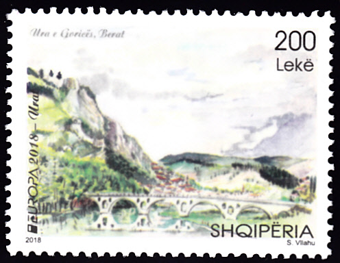 In Albanien erschien eine Europamarke 2018 zum Gemeinschaftsthema "Brücken" am 25.10.2018. Hier die Marke zu 200 Lek mit einer Abbildung der Brücke von Berat aus dem 18. Jahrhundert.