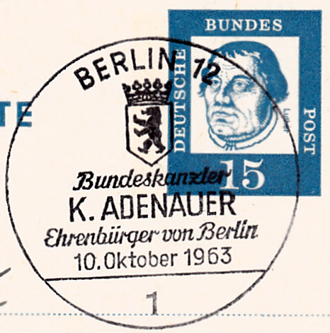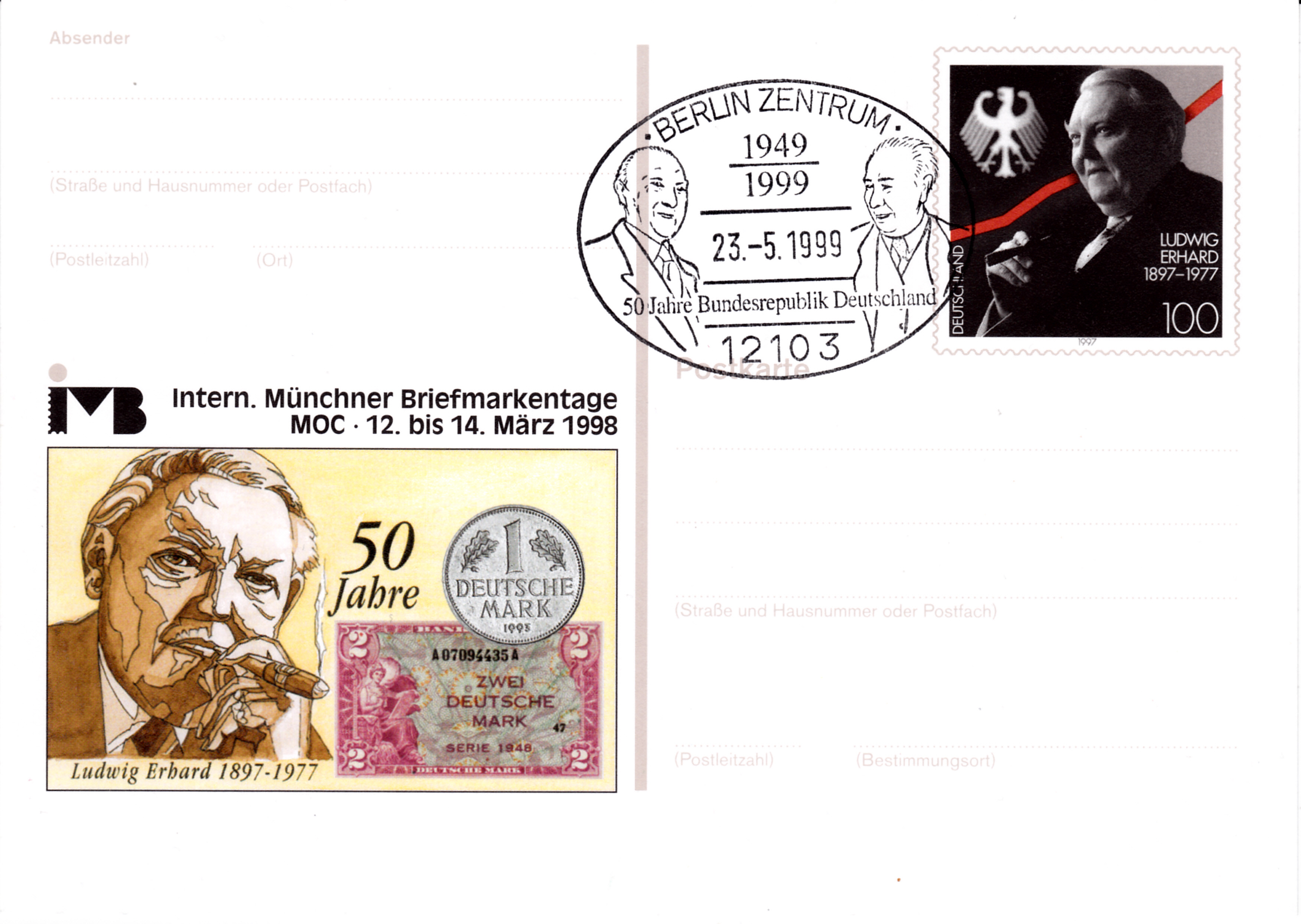 Der Sonderstempel "50 Jahre Bundesrepublik Deutschland" vom 23.5.1999 aus Berlin zeigt Konrad Adenauer und Theodor Heuss im Stempelbild. Der Stempel, wurde auf einer Sonderpostkarte (MiNr PSo 51) abgeschlagen.