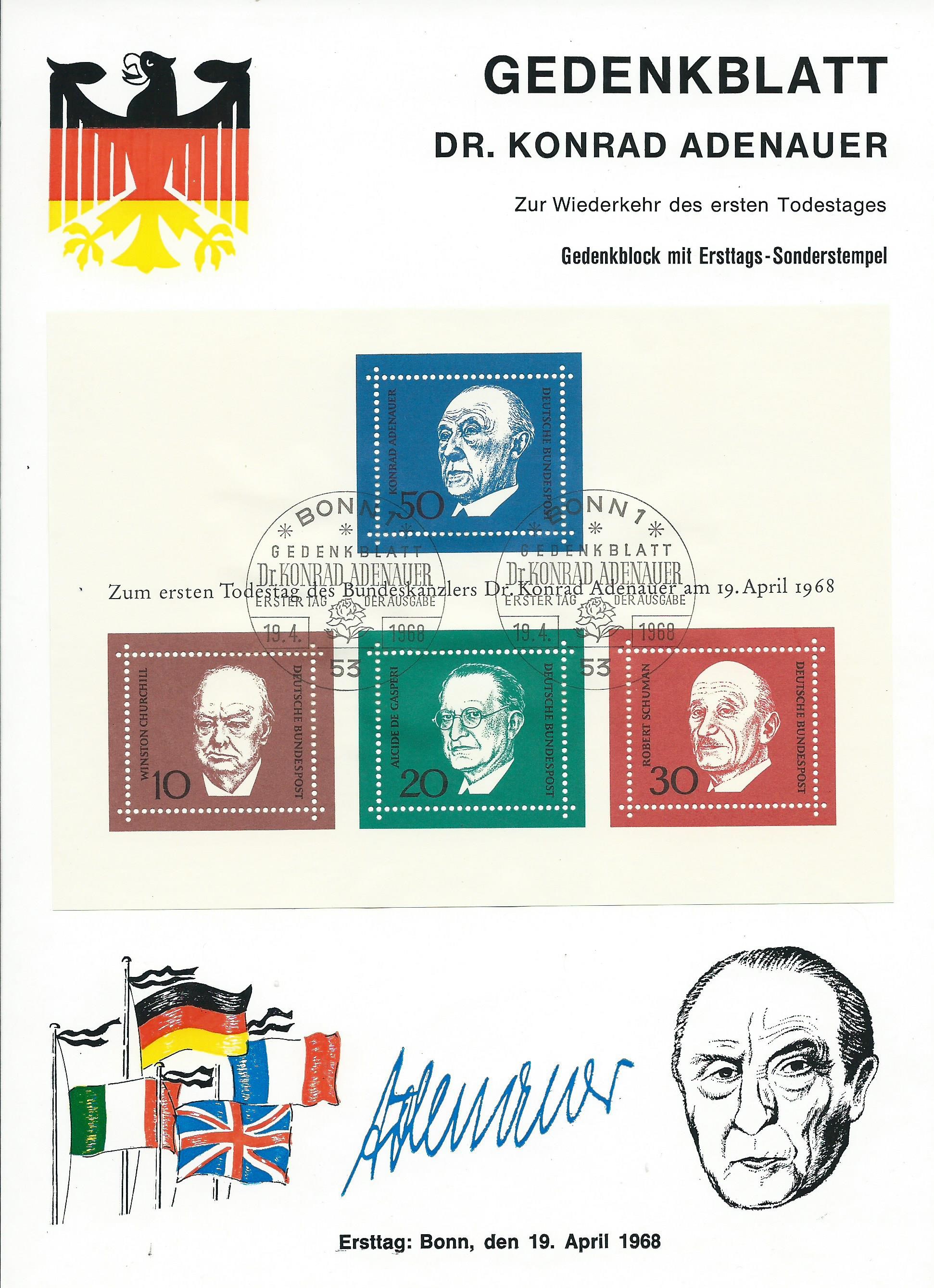 zum Thema Konrad Adenauer ist mir hier noch ein Gedenkblatt mit dem Block 3 in die Hände gefallen. Der Block trägt den Ersttagssonderstempel Bonn vom 19.4.68: