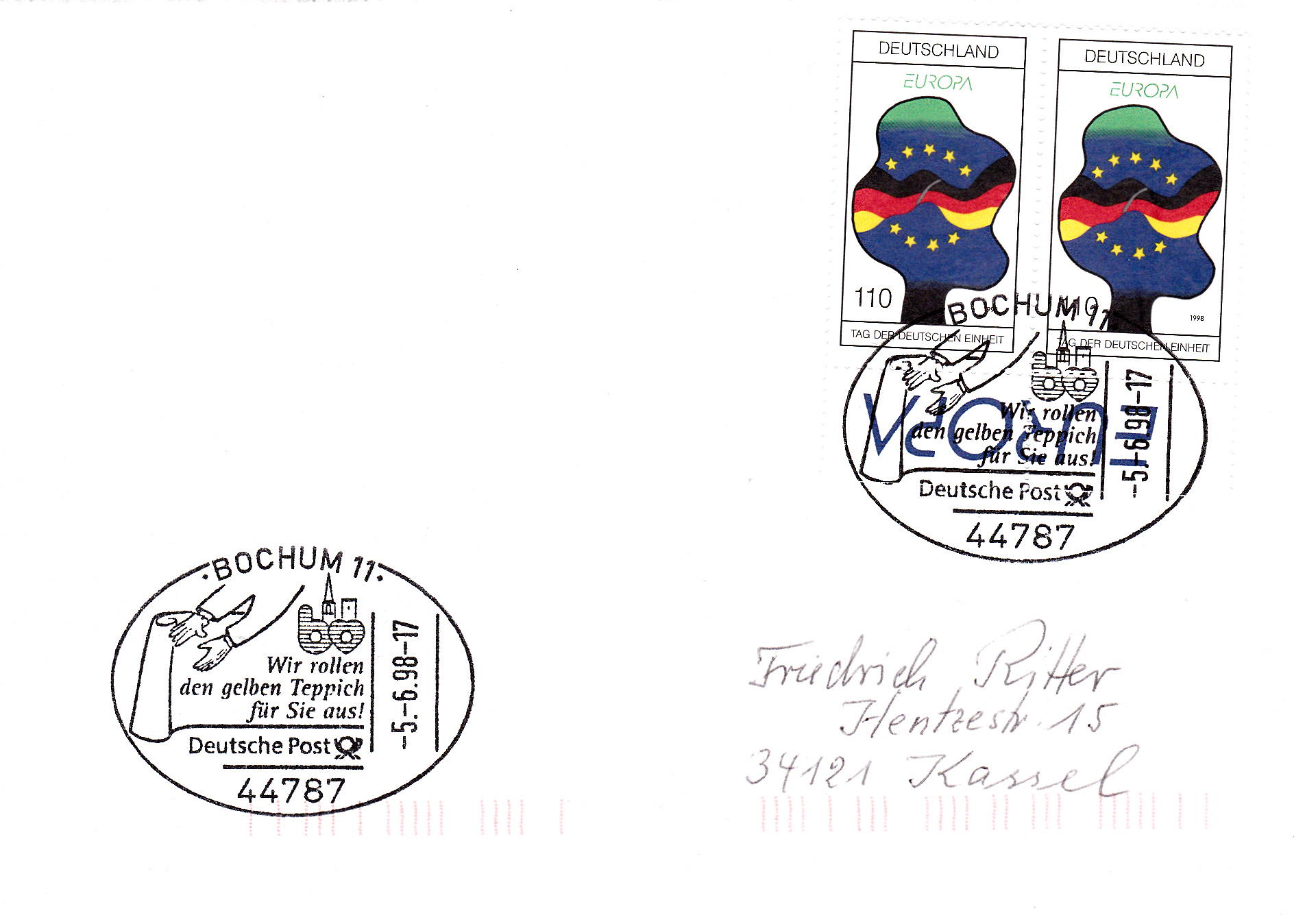 Waagerechtes Paar der Europamarke 1998 auf einem Brief von 21 bis 50 g mit Sonderstempel aus Bochum vom 5.6.1998.