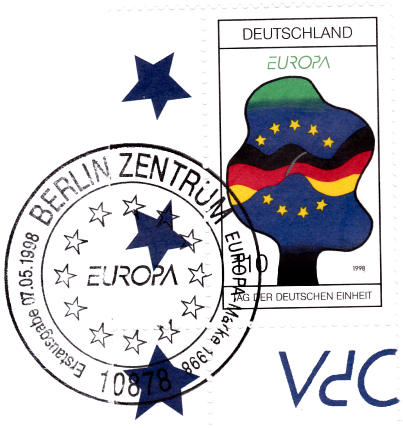 Bei der Deutschen Post erschienen die Europamarken 1998 am 7. Mai 1997 zum Gemeinschaftsthema "Nationale Feste und Feiertage". Hier die Marke zu 110 Pfennig mit einer Darstellung zum Tag der Deutschen Einheit. Die Auflage betrug 25 000 000 Stück.