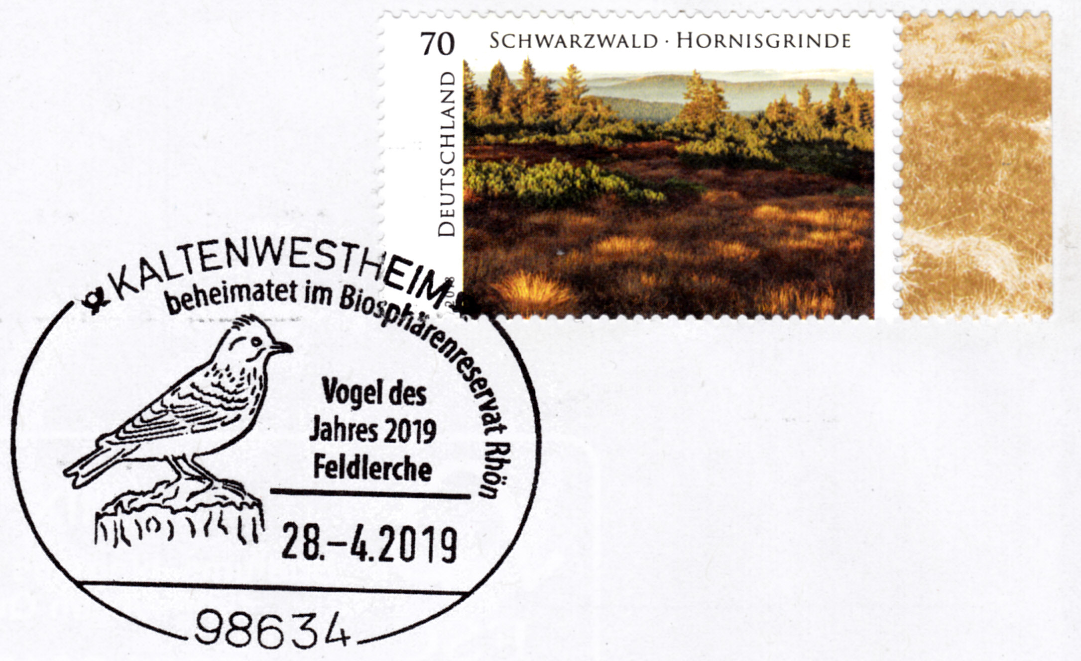 Der Sonderstempel vom 23.10.1998 auf diesem Einschreibebrief aus Sindelfingen stellt eine Feldlerche im Stempelbild vor. Anlass war, dass die Feldlerche 1998 Vogel des Jahres war. Das Porto betrug zu dieser Zeit: Brief bis 20 g 110 Pf und Übergabeeinschreiben 400 Pf, zusammen also 510 Pf.