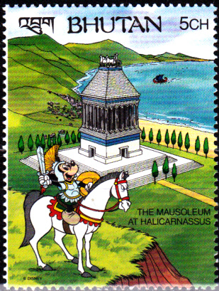 Aus der gleichen Serie aus Bhutan stammt diese Marke (MiNr 1384) mit der Abbildung Mickey Mouse auf dem Pferd vor dem Mausoleum von Halikarnassos.