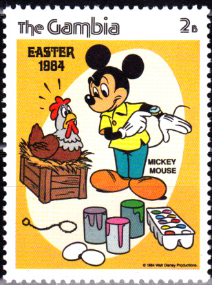 Auf dieser Marke aus einer Serie aus Gambia (MiNr 508), die zu Ostern 1984 erschienen ist, wartet Mickey Mouse darauf, dass das Huhn ein Ei legt. Die Farben zum Ostereierfärben hat Mickey schon bereit gestellt.