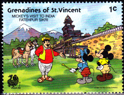 In St. Vincent Grenadinen erschien 1989 eine Serie zur Internationalen Briefmarkenausstellung INDIA ’89 mit Walt Disney Figuren. Auf diesem Wert aus dieser Serie (MiNr 616) sehen wir Micky Maus, Minnie Maus und einen Fremdenführer vor dem „Panch Mahal“ (fünfstöckiger Palast), einem der berühmtesten Bauwerke in Fatehpur Sikri im Bundesstaat Uttar Pradesh in Indien.