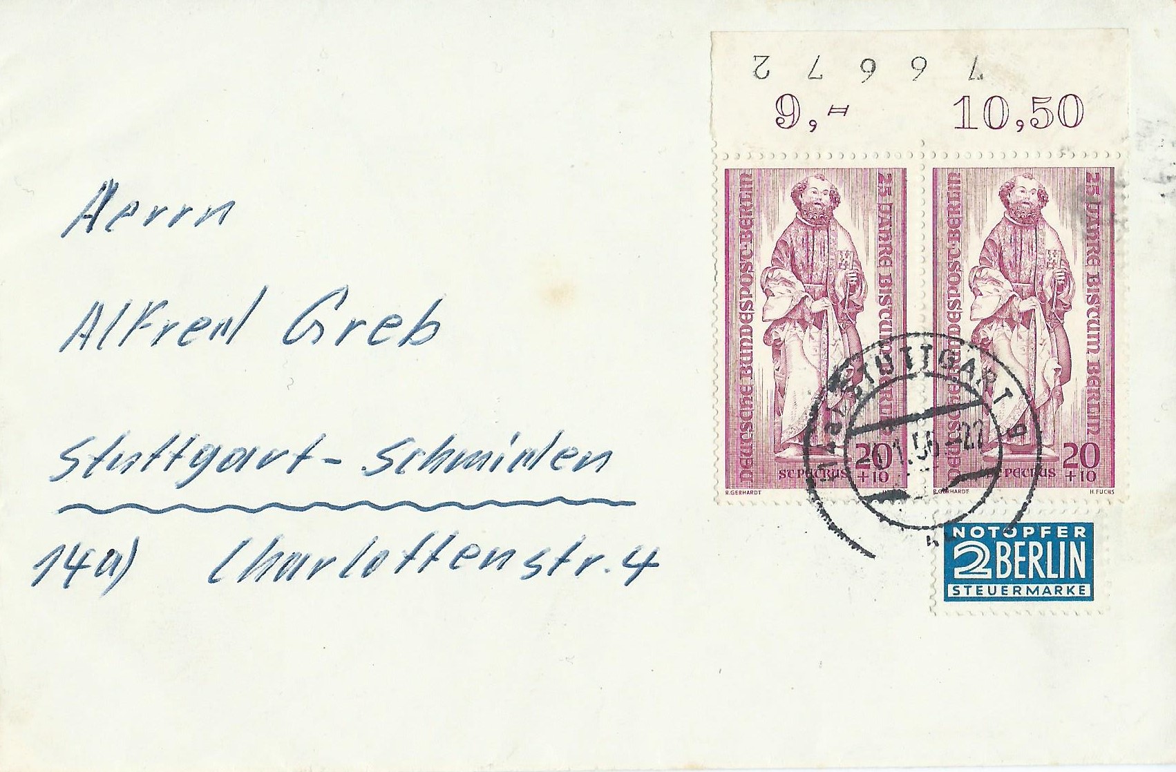 Den Anfang macht die Berlin-Ausgabe Mi.Nr. 134 „Heiliger Petrus“ vom Oberrand als waagerechtes Paar. Im Oberrand ist der Bogenzähler vorhanden, gestempelt wurde der Beleg oin Stuttgart am 3.1.55: