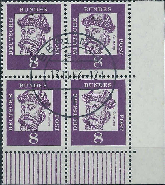 Beim zweiten Stück ist es das Gegenstück zum eben gezeigten, hier ist es der rechte untere Eckrand-4-er-Block. Er wurde auch am 13.11.63 in Berlin 12 gestempelt und zeigt ebenfalls die hohen Walzenstriche.