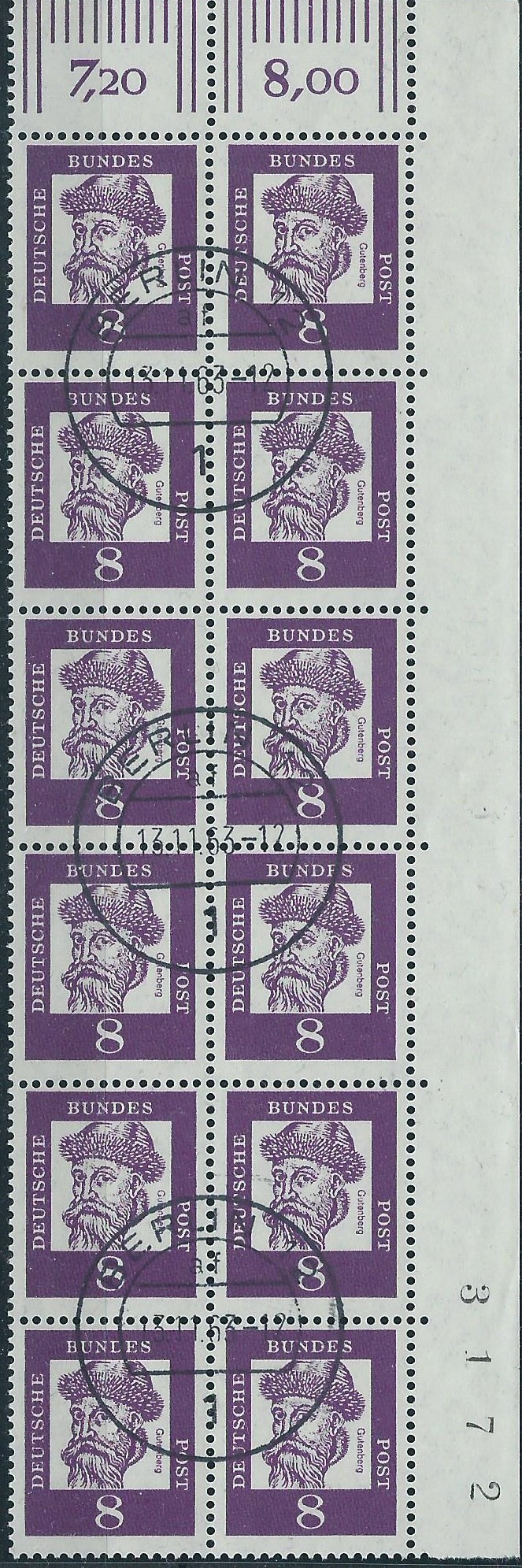 Als Abrundung zum 8 Pf-Wert ein gestempelter senkrechter 12-er-Block aus der rechten oberen Bogenecke. Hier ist im Rand neben den untersten Marken der Bogenzähler zu sehen. Hier wurde wiederum am 13.11.63 in Berlin 12 gestempelt.