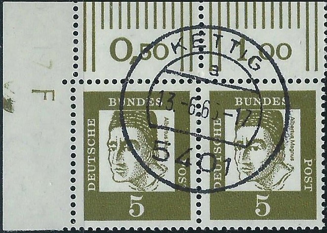 Ein schönes gestempeltes waagerechtes Paar aus der linken oberen Bogenecke zu 5 Pf: Im Seitenrand sieht man auf Höhe der Querzähnung den Randvermerk F. Die Erstauflage einiger Werte hatte zur Kennzeichnung der Fluoreszenz diesen Buchstaben zusammen mit einem Druckerzeichen im Seitenrand. Hier ist besonders schön noch der Abdruck vom Schraubenkopf zu sehen. Gestempelt wurde in Kettig am 13.6.63. Das schöne Stück verdanke ich dem Hinweis eines Sammlerfreundes, welcher es bei ebay gefunden hat. Ihm gebührt großer Dank!