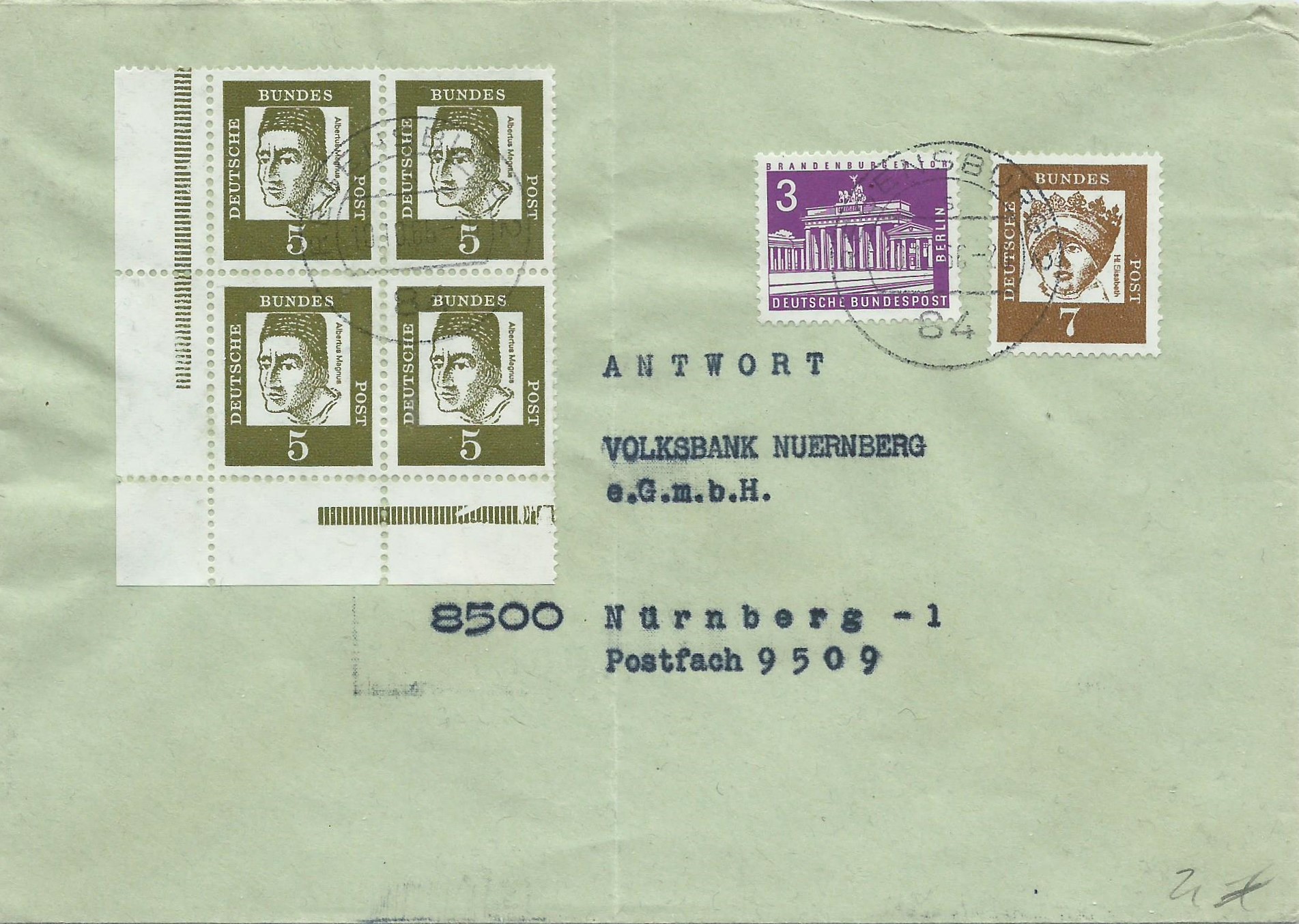 von der Serie Bedeutende Deutsche kann ich noch einige Beleg-Neuzugänge zeigen. Den Anfang macht ein 4-er-Block zu 5 Pf aus der linken unteren Ecke vom Heftchenbogen nebst Beifrankatur einer Einzelmarke zu 7 Pf und einer weiteren der Serie Berliner Stadtansichten zu 3 Pf auf einem Brief an die Volksbank Nürnberg. Gestempelt wurde der Beleg am 10.10.65 in Regensburg.