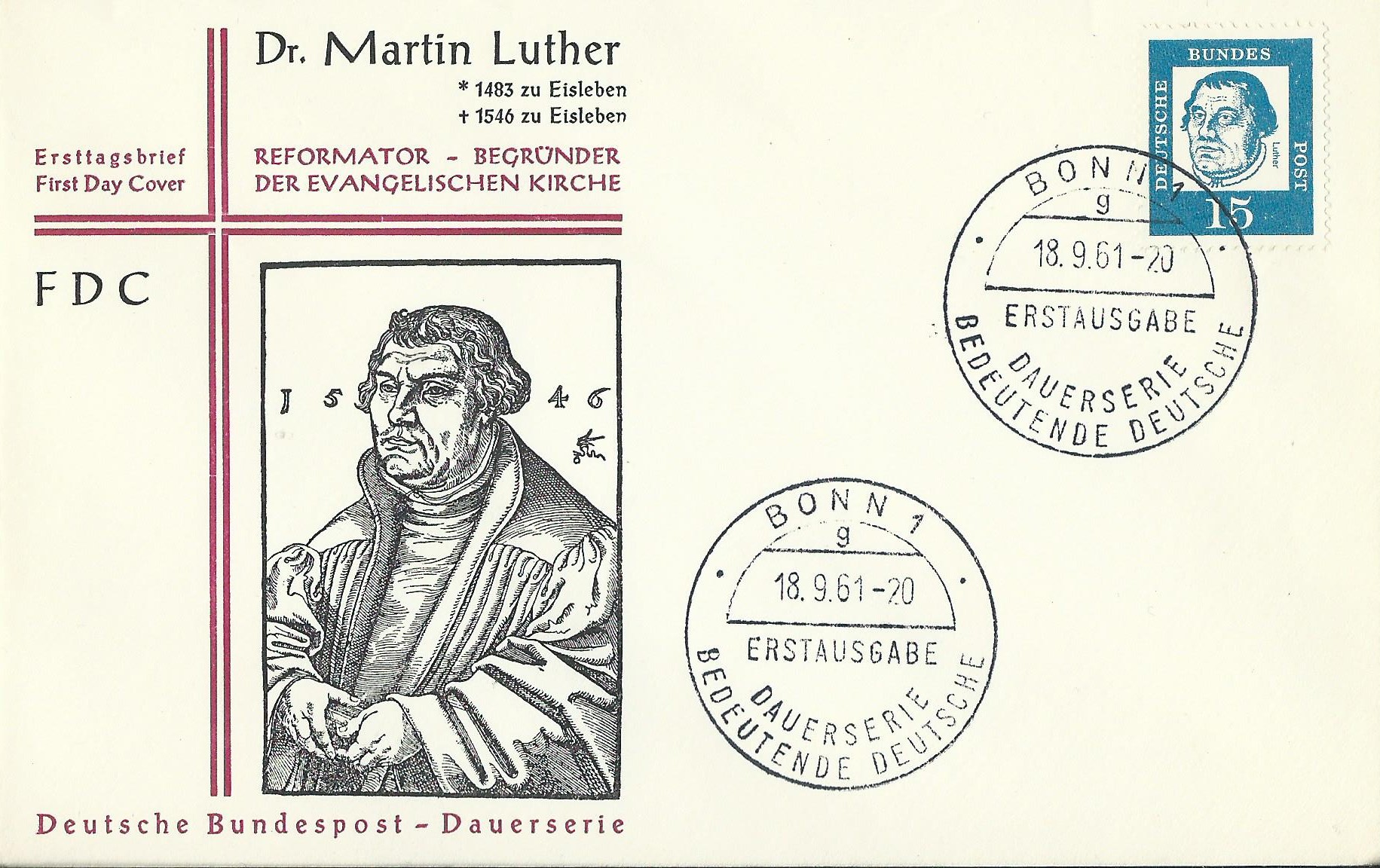 Wir hatten ja im Vorwege schon mal erwähnt, dass die Ersttagsstempel dieser Serie verschiedene Unterscheidungsbuchstaben aufweisen. Hier kommt nun ein Ersttagsbrief der Marke zu 15 Pf mit dem Ersttagsstempel Bonn vom 18.9.61 und dem Unterscheidungsbuchstaben „g“.