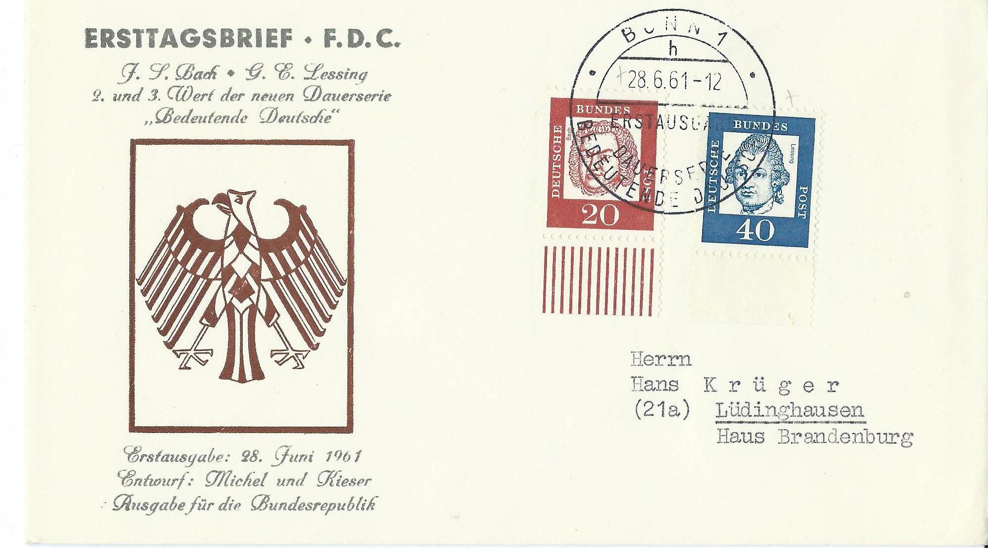 Hier nun ein Ersttagsbrief der Werte zu 20 und 40 Pf, die Marke zu 20 Pf sogar vom Unterrand. Der Ersttagsstempel Bonn vom 28.6.61 hat den Unterscheidungsbuchstaben „h“.