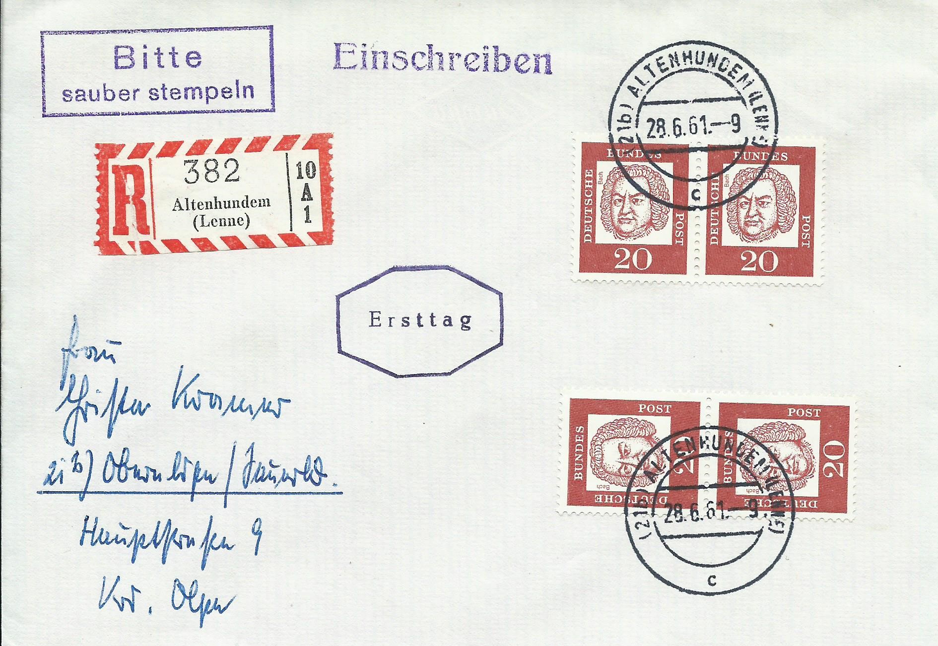 Ebenfalls in der Form ein Ersttagsbrief der 20 Pf-Marke. Hier haben wir ein senkrechtes und ein waagerechtes Paar der Marke. Er wurde auch als Einschreiben befördert und am 28.6.61 in Altenhundem gestempelt.