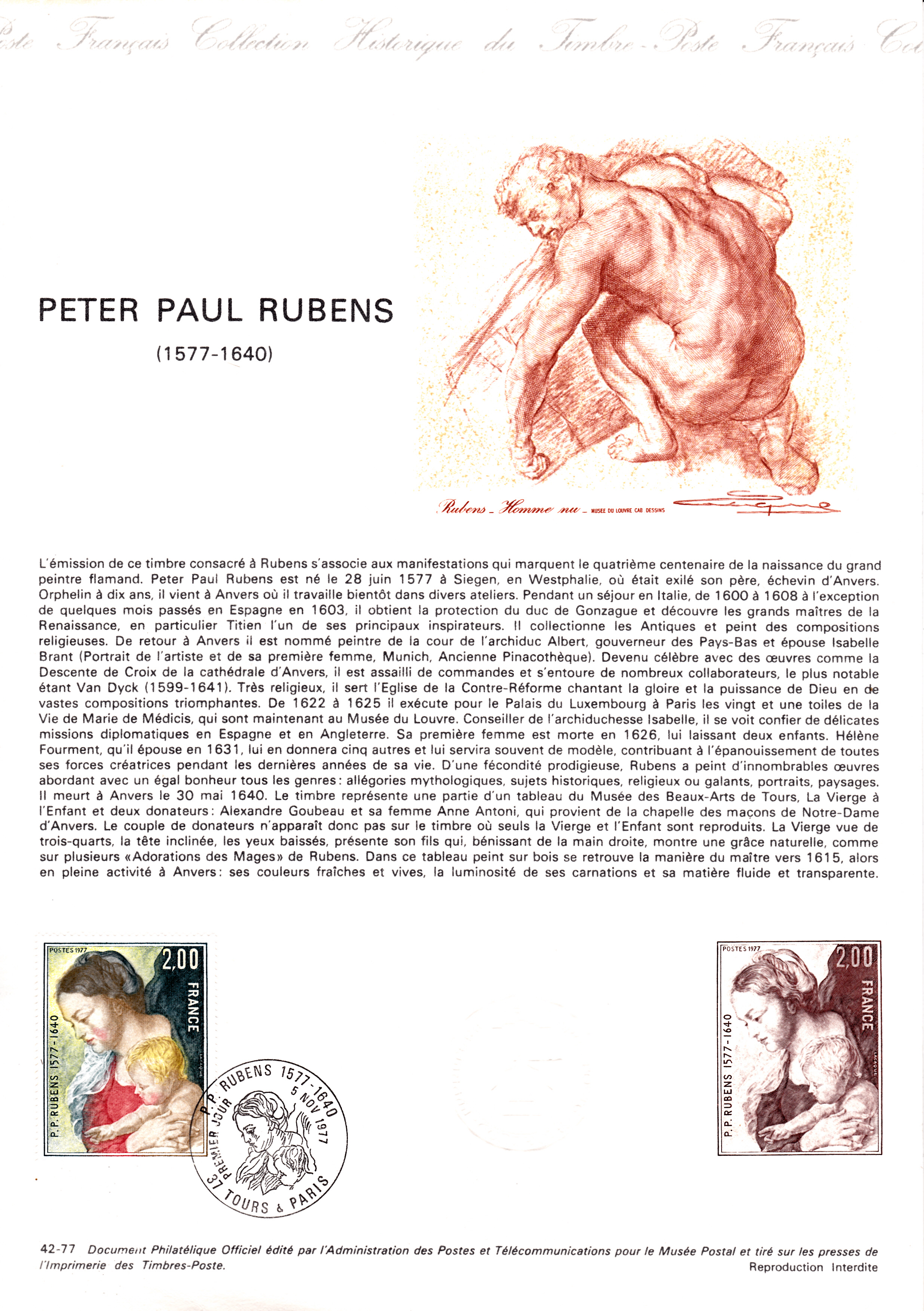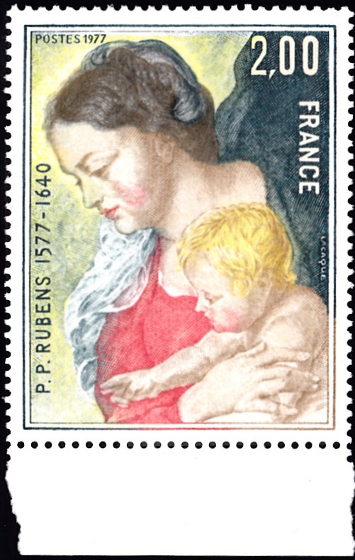 Zum 400. Geburtstag von Peter Paul Rubens erschien in Frankreich diese Marke (MiNr 2052) mit dem Detail "Jungfrau mit Kind" aus dem Gemälde "Madonna und Kind mit den Spendern Alexandre Goubeau und seine Frau Anne Antoni" von Peter Paul Rubens.