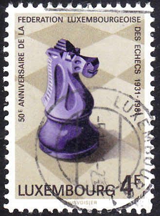 Zu Jubiläum "50 Jahre Luxemburger Schachverband" erschien 1981 in Luxemburg eine Marke (MiNr 1033) mit einem Springer auf einem Schachbrett.