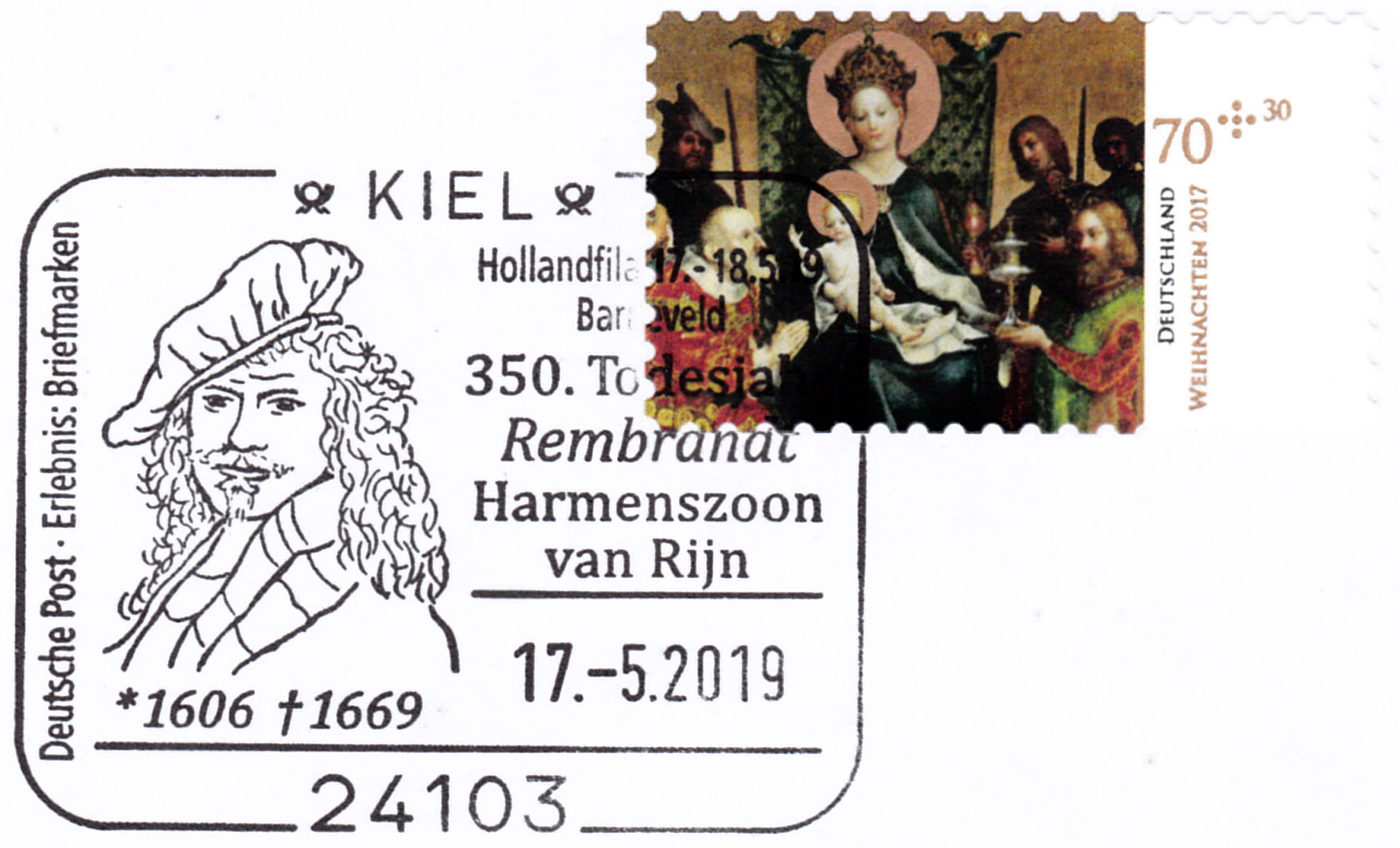 Sonderstempel vom 17.5.2019 zum 350 Todestag von Rembrandt Harmenszoon van Rijn. Im Stempelbild wird ein Selbstporträt von Rembrandt gezeigt.