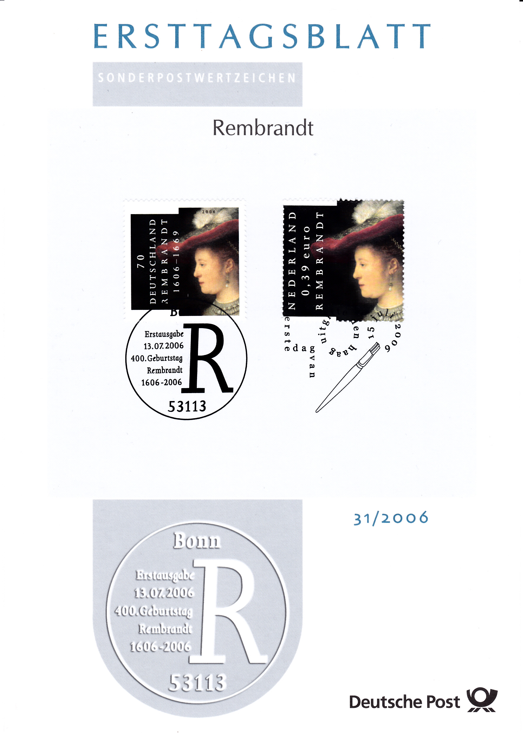 Das Ersttagsblatt der Deutschen Post mit der Marke zum 400. Geburtstag von Rembrandt (MiNr 2550) zeigt auch die bildgleiche Marke aus den Niederlande (MiNr 2412).