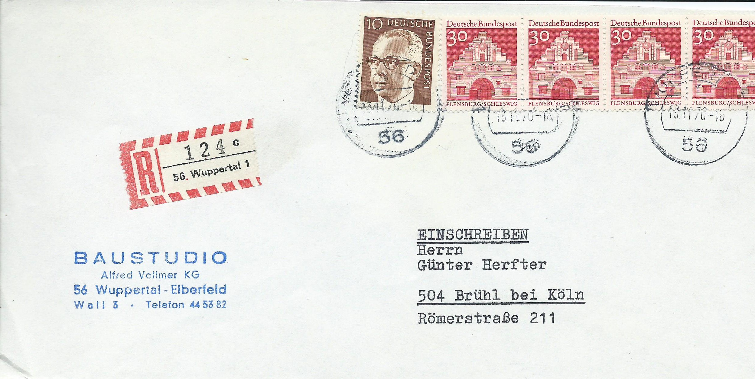 von der Serie Große Bauwerke kann ich noch einige Beleg-Neuzugänge zeigen. Einmal ein waagerechter 4-er-Streifen der roten 30 Pf-Marke nebst einer 10 Pf-Heinemann-Marke als Einschreiben. Gestempelt wurde der Beleg am 13.11.70 in Wuppertal.
