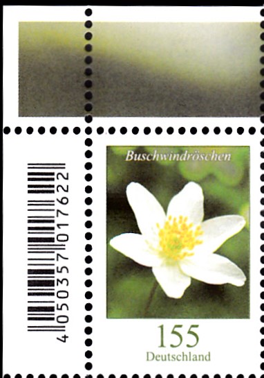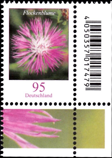 Am 1.6.2019 sind, wie bereits hier von Jens angekündigt, neue Wertstufen bzw schon vorhandene Wertstufen mit neuen Motoven. Es gibt eine Marke zu 60 Cent (MiNr 3468) mit dem neuen Motiv "Kornblume". Hier eine Bogenmarke vom Eckrand mit EAN-Codierung.