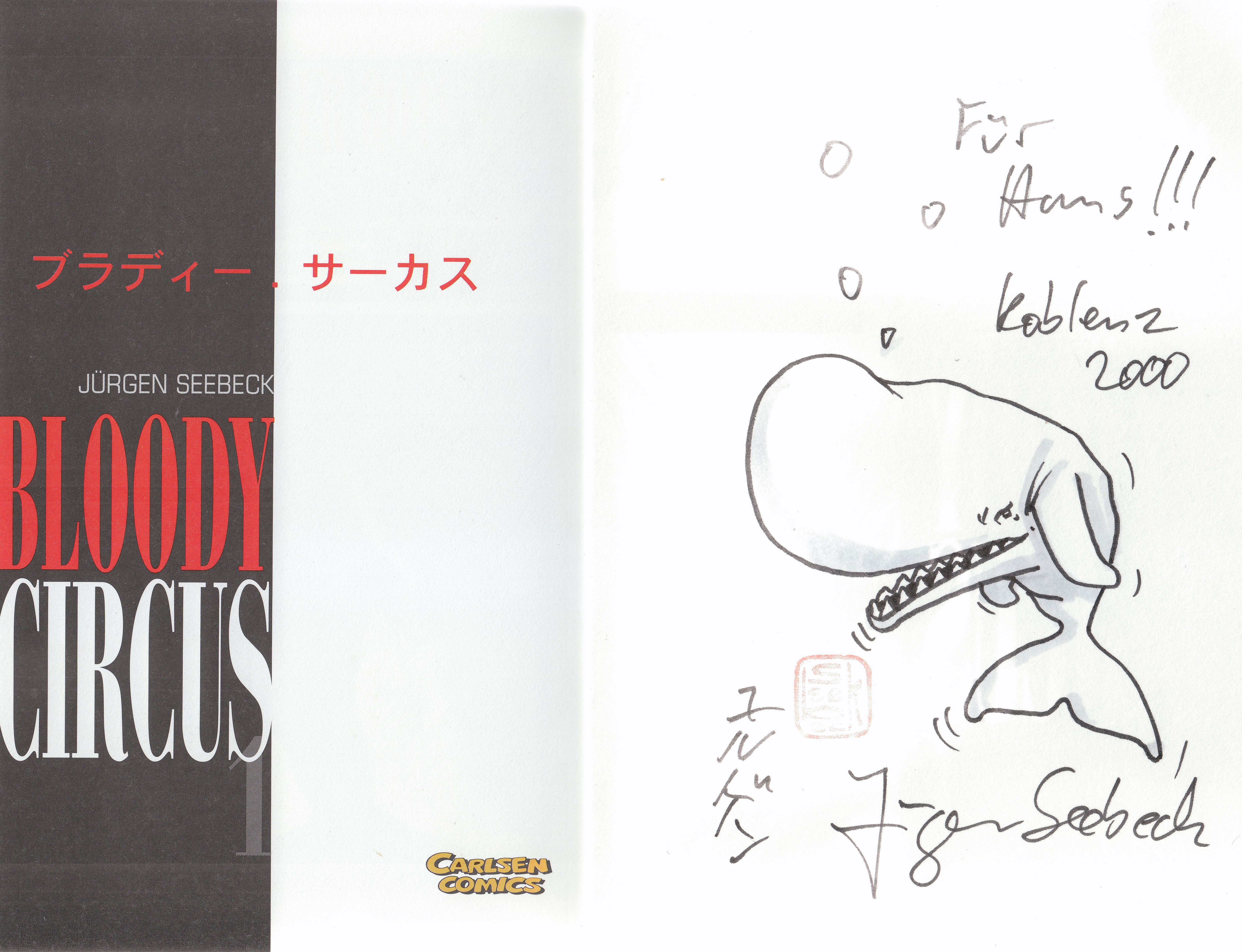 Hier "BLOODY CIRCUS 1", mit einem Sketch versehen sowie signiert von Jürgen Seebeck in Koblenz am 09.12.2000: