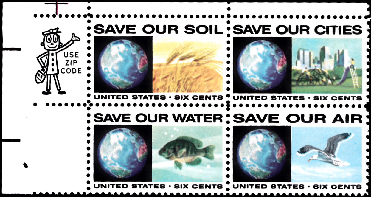 Diese vier Marken wurden zusammenhängend in Viererblockanordnung gedruckt. Dieser Viererblock vom linken oberen Bogenrand hat zwei Randbesonderheiten: ein Passerkreuz und einen "ZIP CODE".
