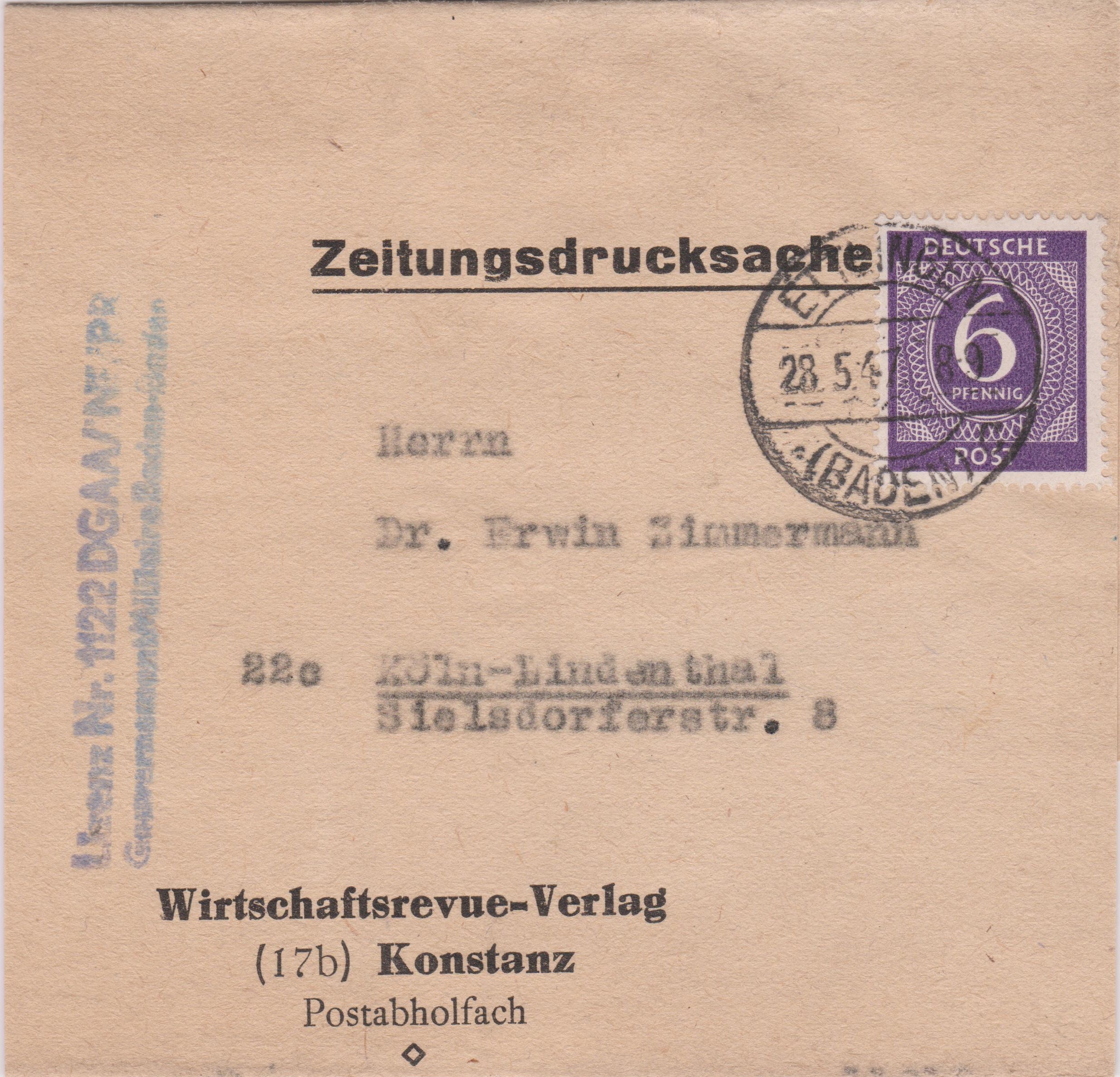Der Beleg wurde dann einer Drucksache entsprechend mit einem 6 Pf Wert der Ziffernserie als EF freigemacht aufgegeben: