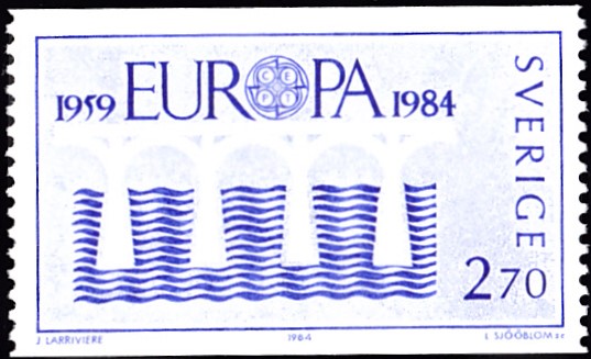 In Schweden erschienen die Europamarken 1984 anlässlich dem Jubiläum "25 Jahre Europäische Konferenz der Verwaltungen für das Post- und Fernmeldewesen (CEPT)" im einheitlichen Motiv "Brücke" am 9. Februar 1984. Hier die Marke zu 2,70 Kronen, die in einer Auflage von 8 594 000 Stück erschien.