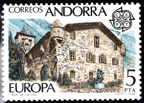 Bei der spanischen Post in Andorra erschienen am 2. Mai 1978 die Europamarken 1978 zum Gemeinschaftsthema "Baudenkmäler". Hier die Marke zu 5 Peseta mit dem Alten Rathaus in Andorra la Vella. Die Auflage betrug 984 221 Stück.