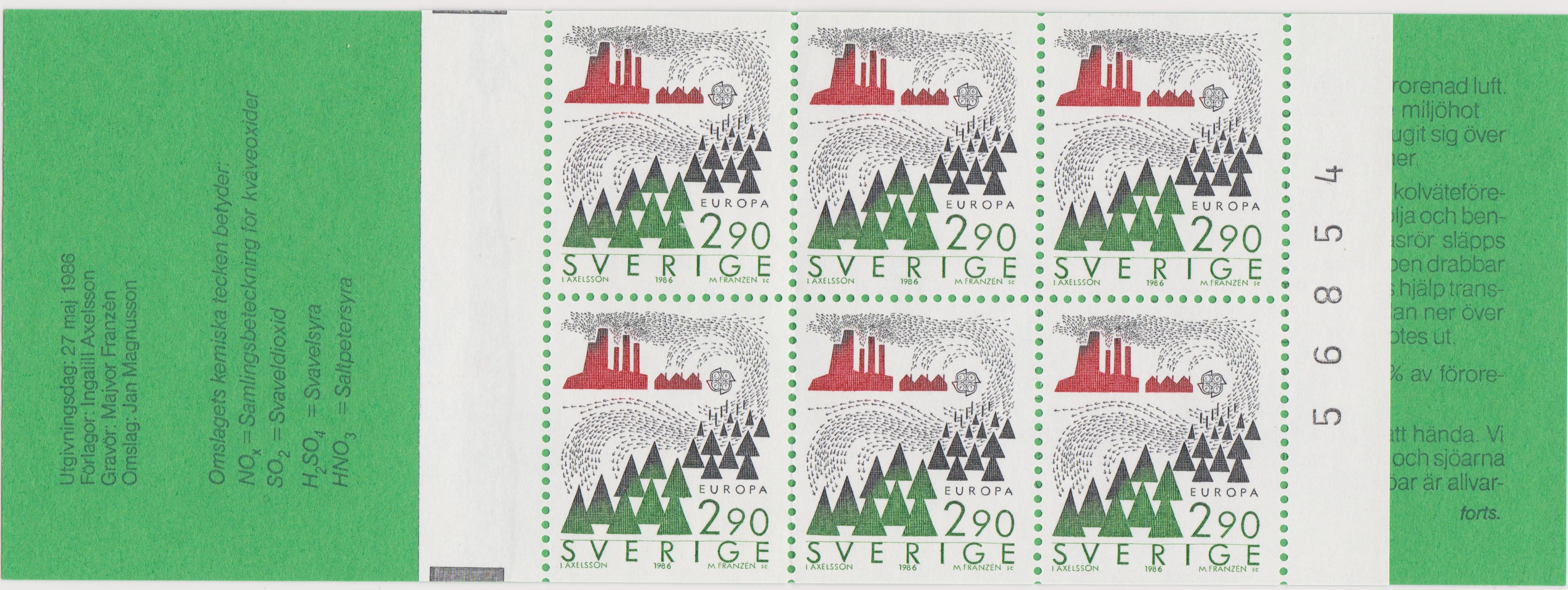 In Schweden sind die Europamarken 1986 zum Gemeinschaftsthema "Natur- und Umweltschutz" am 27. Mai 1986 erschienen. Hier die Marke zu 2,90 Kronen mit einer Darstellung zum Thema Umweltverschmutzung durch Industrieabgase. Die Auflage betrug 8 100 000 Stück. Hier zeige ich eine oben nicht gezähnte Marke (MiNr 1398 Do).