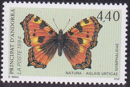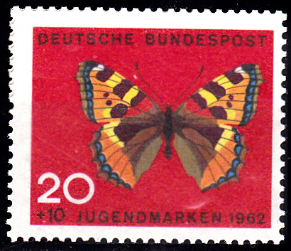 Die Marke zu 20+10Pf der Jugendmarken 1962 der Deutschen Bundespost (MiNr 378) zeigt einen Kleinen Fuchs (Aglais urticae).