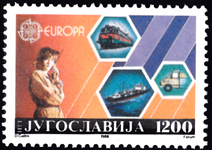 In Jugoslawien erschienen die Europamarken 1988 zum Gemeinschaftsthema "Transport- und Kommunikationsmittel" am 30. April 1988. Hier die Marke zu 450 Dinar mit einer Frau mit Funktelefon, einer Eisenbahn, einem Schiff und einem Transportfahrzeug. Die Marke erschien in einer Auflage von 390 000 Stück.