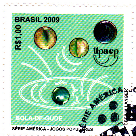 Auf einem Wert aus einem Zusammendruck aus Brasilien (MiNr 3657) zum Thema "Kinderspiele" sind Murmeln abgebildet. Die Bildbeschreibung auf der Marke "BOLA-DE-GUDE" bedeutet auf Deutsch wörtlich "Ball aus Marmor" und gibt im Namen des Spieles im Portugiesischen bereits einen Hinweis auf die Verbreitung im Altertum.