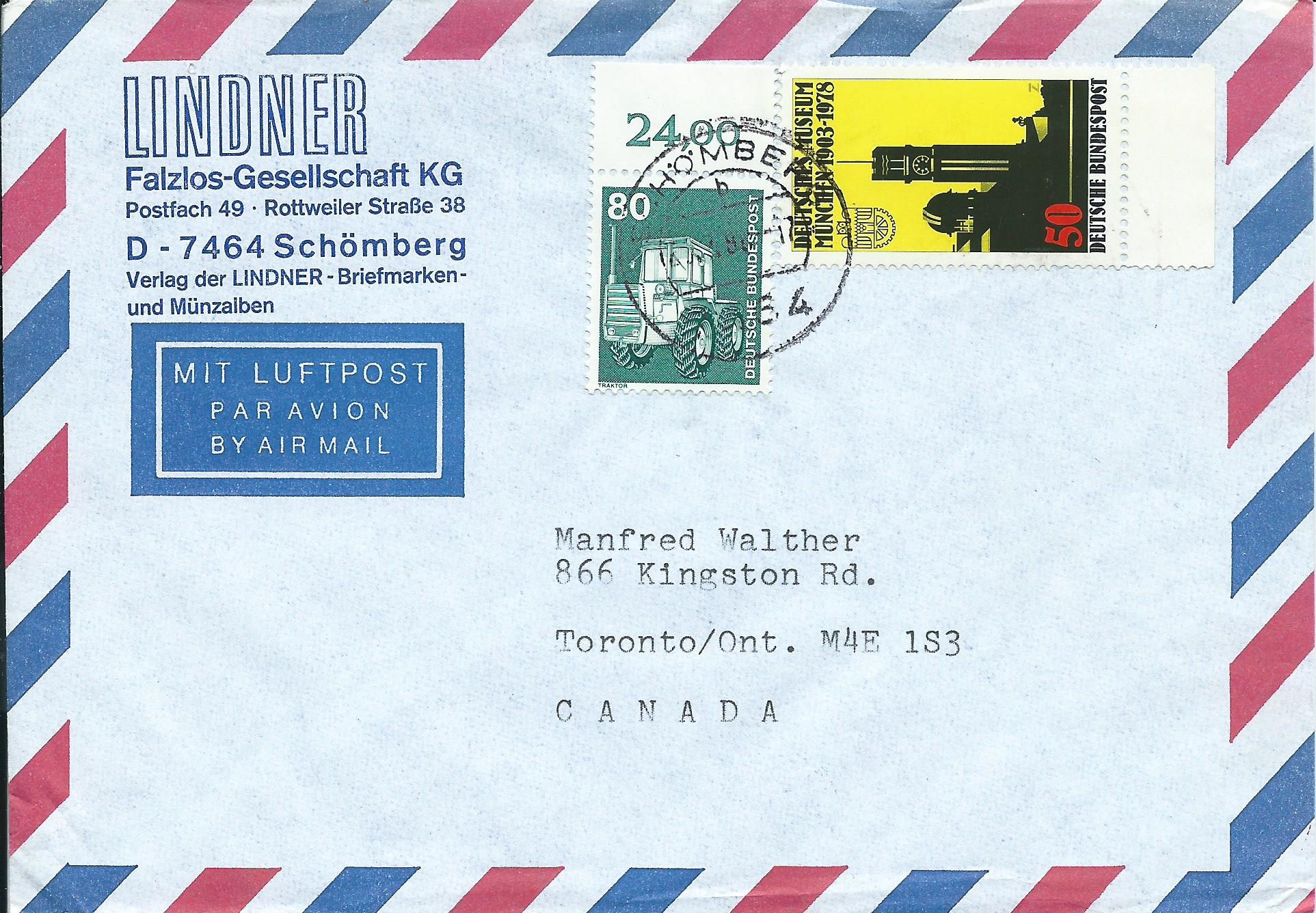 Ein Oberrandstück mit Reihenwertzähler 24,00 nebst einer Sondermarke zu 50 Pf Deutsches Museum auf einem Luftpostbrief nach Canada. Gestempelt wurde der Beleg am 23.4.85 in Schömberg.