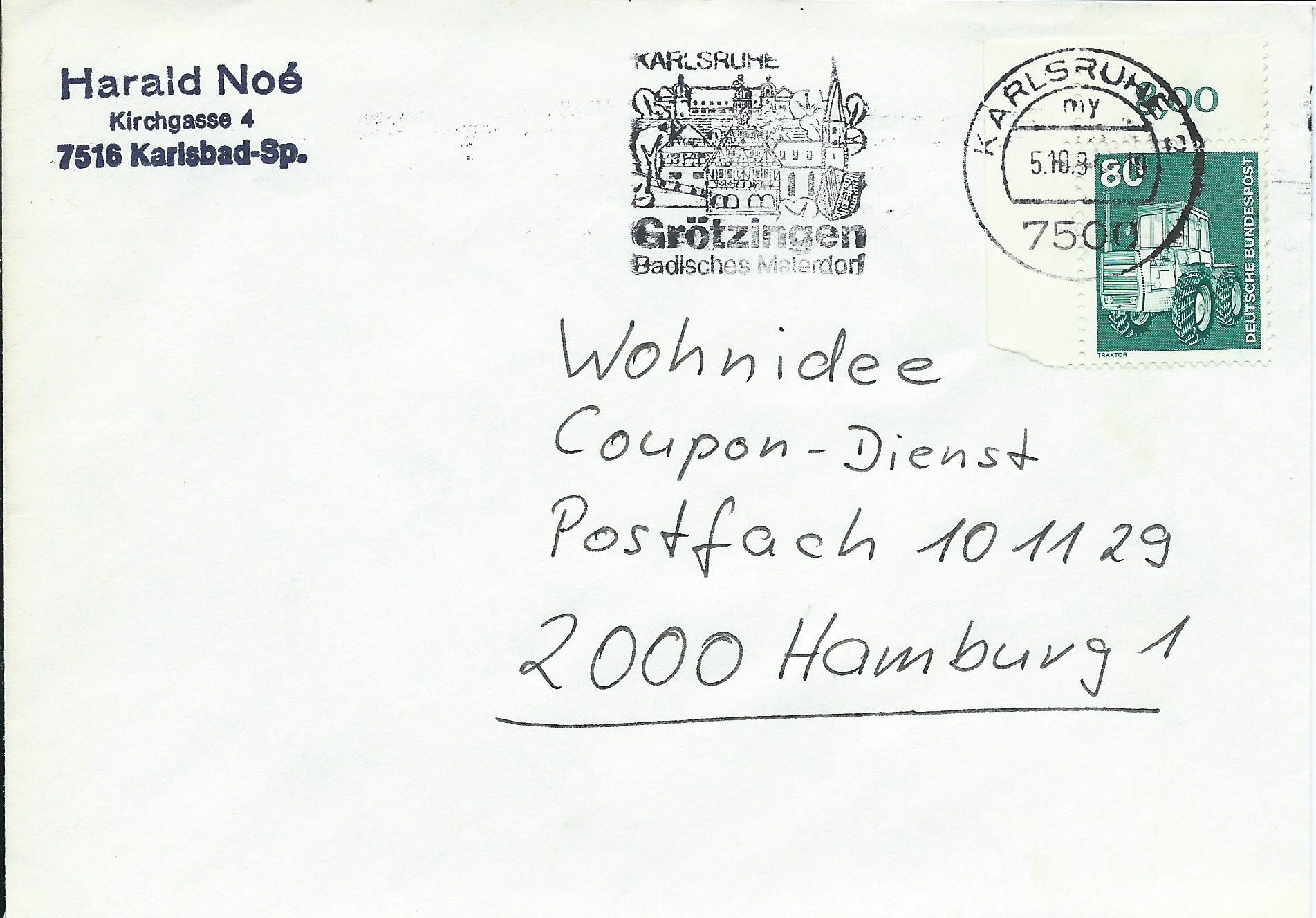 Hier eine linke obere Bogenecke, gestempelt wurde der Beleg am 5.10.84 in Karlsruhe.