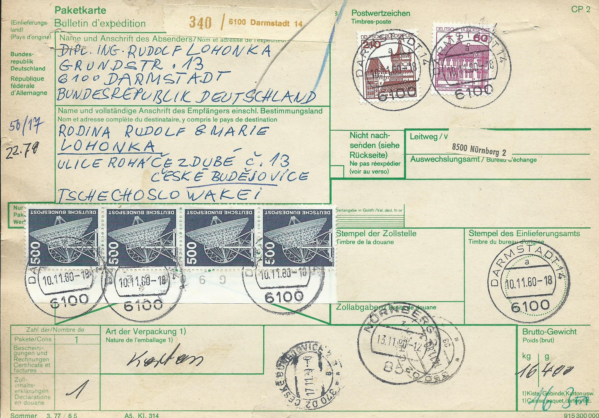 hier kann ich einen senkrechten 4-er-Streifen der Marke zu 500 Pf Industrie und Technik nebst weiterer Beifrankatur auf einer Auslandspaketkarte zeigen. Auf dem Bogenrand ist noch die Bogenzählnummer in Form von Buchstabe „G“ und einer 6-stelligen Nummer zu sehen. Gestempelt wurde am 10.11.80 in Darmstadt.
