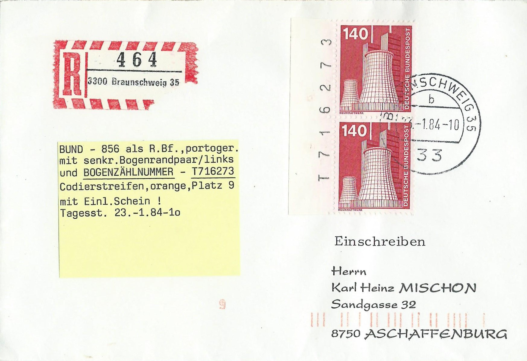 Der erste trägt als Frankatur ein senkrechtes Paar der Marke zu 140 Pf vom linken Seitenrand mit Bogenzählnummer. Der Brief wurde als Einschreiben befördert und am 23.1.81 in Braunschweig gestempelt. Das schöne daran ist, dass die Beschreibung in Form eines kleinen Zettels gleich mitgeliefert wurde.