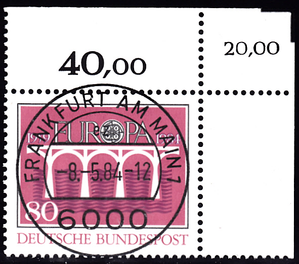 Auch diesem am 8.5.1984 erschienene Europamarke zu 60Pf hat einen mit korrigierten Bogenwertzähler und zusätzlich einen Schneidewinkel rechts oben in der Ecke.